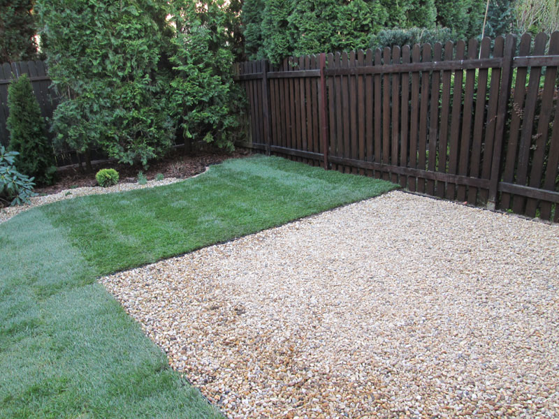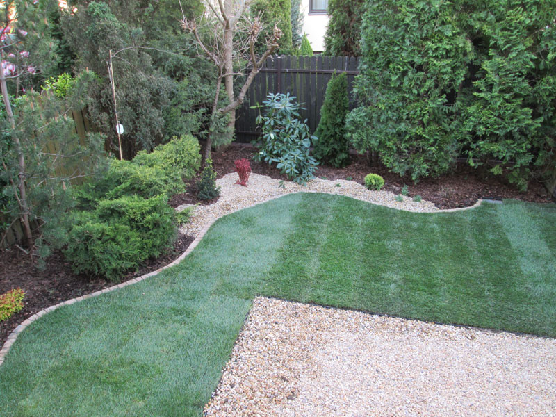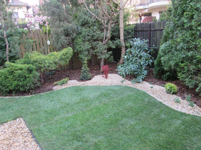 To przykład dziesięcioletniego ogródka, z zaniedbanymi i źle prowadzonymi roślinami. Po wycięciu uschniętych roślin, uformowaniu istniejących, dosadzono nowe krzewy, na całość rabaty rozłożono tkaninę, wysypano korą i żwirem rzecznym miodowym oraz wykonano obrzeże z kostki. Starą darń zastąpił trawnik z rolki. Patio zostało wykonane także ze żwiru miodowego.